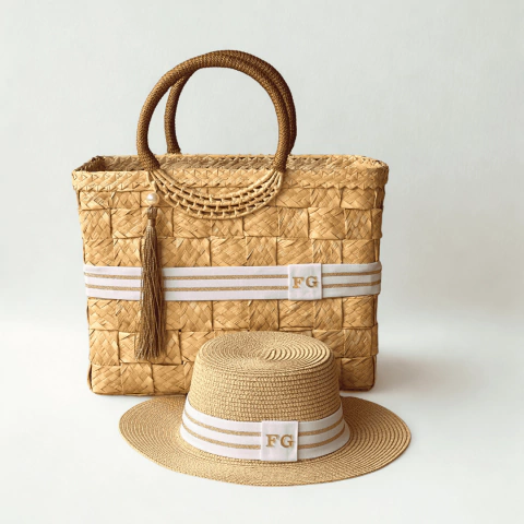 Nesse Kit, a Bolsa e o Chapéu acompanham uma faixa bege/cáqui personalizada e removível, com suas iniciais em acrílico dourado de sua escolha, podendo ser uma letra maior, por exemplo "A", ou duas letras menores, por exemplo "AB", de acordo com a nossa disponibilidade.